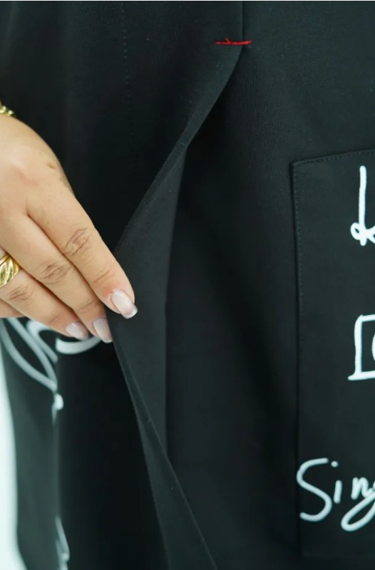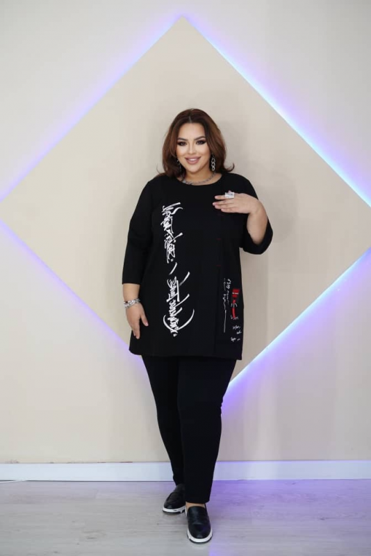 Стильная туника выполнена из плотного трикотажа. Трикотаж приятный, не рыхлый, умеренно эластичный. Чем то напоминает плотную вискозу, но тоньше, чем академик. Внутренняя сторона трикотажа по виду гладкая, на ощупь мягкая, слегка бархатистая.
