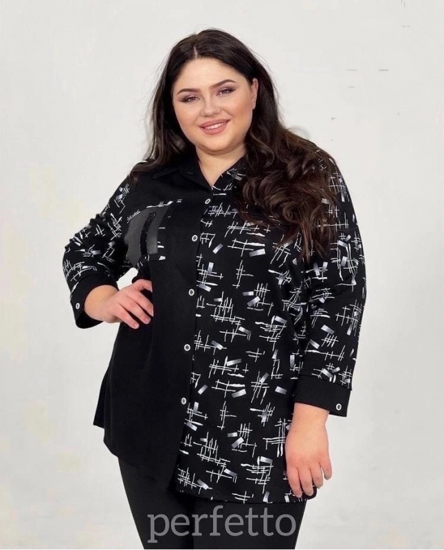 Шикарная туника - рубашка выполнена из сочетания двух видов трикотажа: черный гладкий ( плотный, умерено эластичный) и с рисунком( чем то похож на ангору, но не пушистый, мягкий, эластичный, средней плотности).