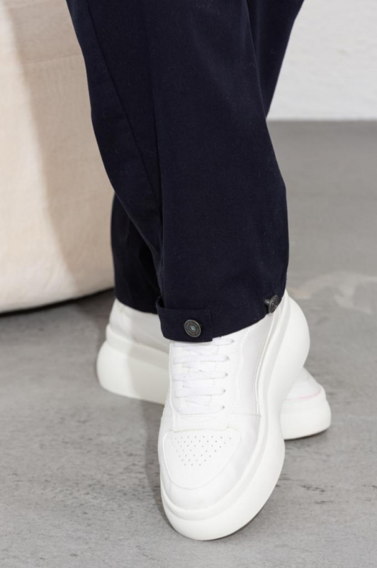СИлуэт слегка заужен книзу. Внизу брючин так же декор патой, которая застегивается на пуговицу клепку и 2 варианта застажки ( регулировка ширины низа брючины)