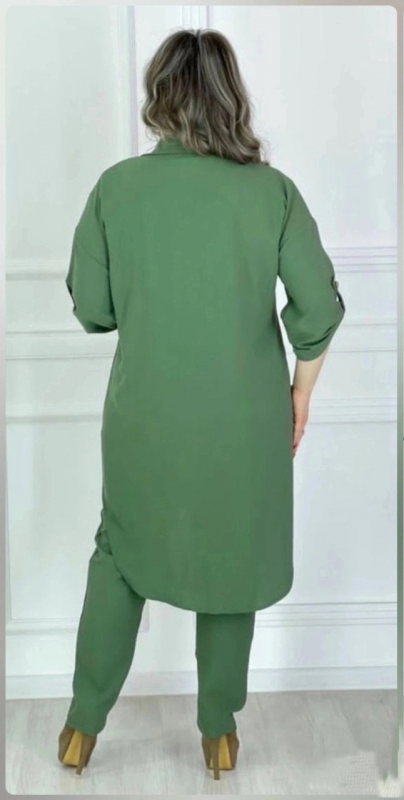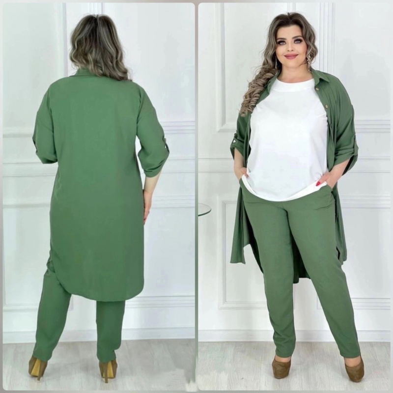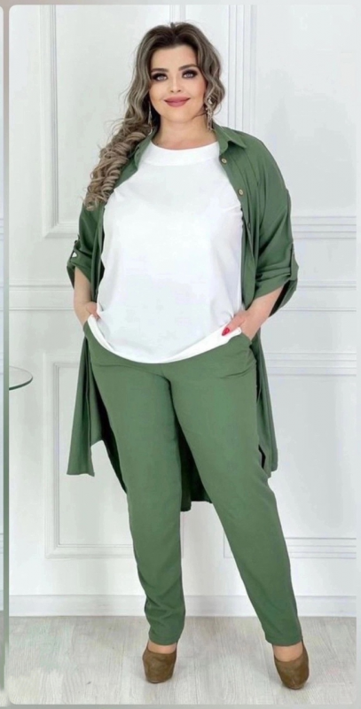 Легкий., летний костюм состоит из топа, брюк и рубашки. Топ выполнен из ткани лайт ( легкая, слабоэластичная, гладкая, приятная к телу) . Брюки и рубашка выполнены из ткани сингапур с добавлением небольшого количества хлопка. Ткань легкая, маломнущаяся, умеренно эластичная, с крэш эффектом( жатость).