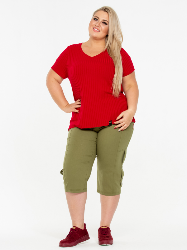 Вырез горловины V-образный, который эффектно подчеркивает шею и визуально удлиняет её.