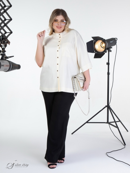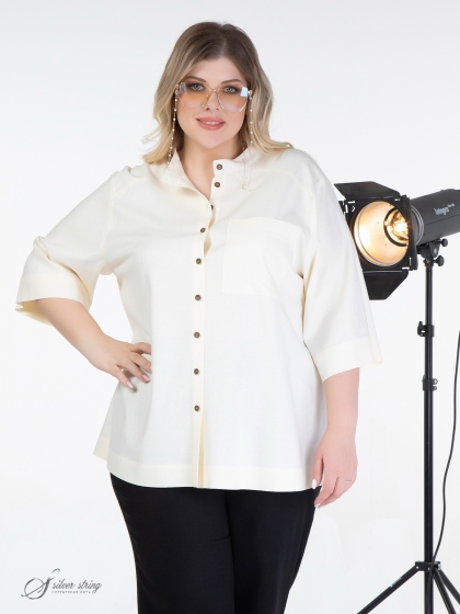 Эффектная блуза-рубашка прямого силуэта, с удлиненной линией плеча, выполнена из эластичной однотонной ткани с высоким содержанием льняного волокна. На полочке и спинке обработана единая подрезная кокетка. Горловина оформлена воротником - стойкой. По борту расположена застежка на пуговицы контрастного цвета. Модель с втачным рукавом, длиной за локоть, низ рукава можно отвернуть на лицевую сторону, корректируя его длину по своему желанию. На левой части полочки настрочен нагрудный карман. В боковых швах обработаны небольшие разрезы. Это комфортная модель в спортивном стиле, которая прекрасно впишется в Ваш гардероб.
