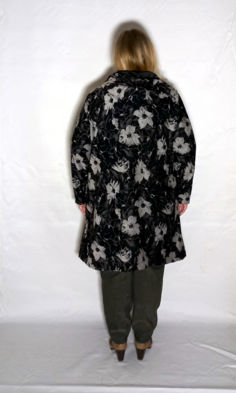 Стильный кардиган-ветровка выполнен из шанель-велюр полотна с интересным принтом. Для отделки использовали тесьму с надписями.