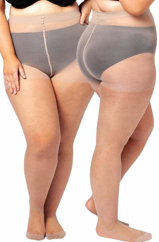 Женские колготки большого размера из высококачественного полиамида с лайкрой, с поддерживающими шортиками, имеют один усиленный плоский шов, с небольшим утягивающим эффектом ног, укрепленный мысок, прозрачные.