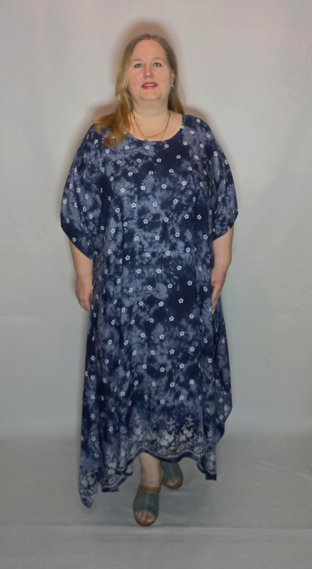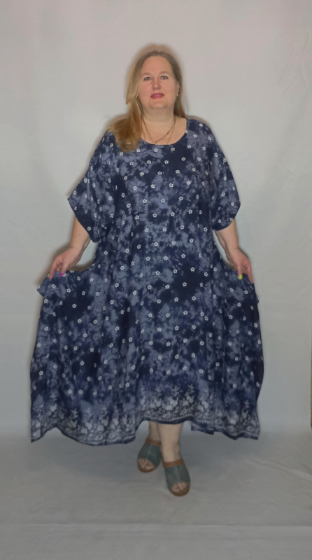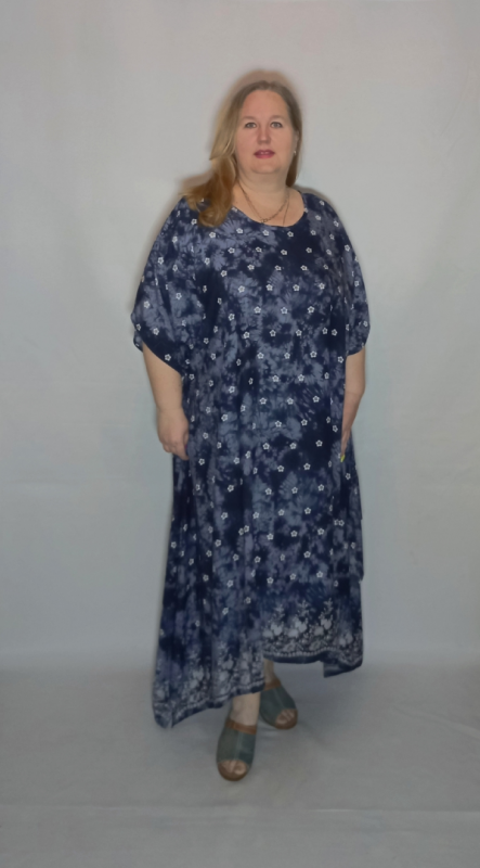 Легкое, игривое, летнее платье выполнено из штапеля-джинс( 100% вискоза). Ткань легкая, пластичная, не эластичная, хорошо драпируется, умеренно мнется, хорошо дышит и пропускает воздух.Это "вареный" штапель, чем обусловлены разводы на ткани, а рисунок, имитирующий вышивку, нанесен принтом. Принт можно гладить, не прилипает