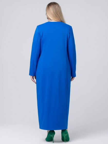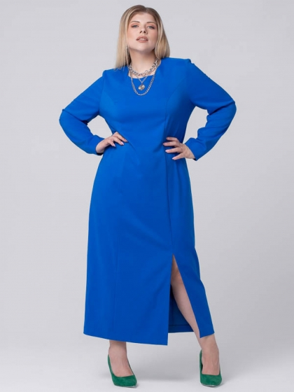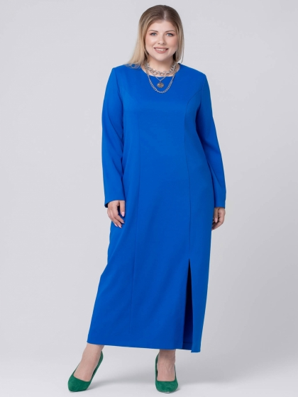Элегантное удлиненное платье полуприлегающего силуэта выполнено из эластичной смесовой ткани яркого цвета. Вертикальные рельефы, по полочке и спинке, моделируют силуэт изделия. С левой стороны, в рельефе полочки, расположен высокий, изящный разрез. Линия горловины округлой формы. Рукав втачной, длинный. Это платье идеально подходит для различных случаев и особых мероприятий, подчеркивая вашу элегантность и утонченный вкус.