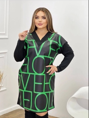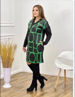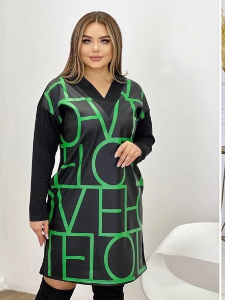 СТильное платье-туника выполнено из сочетания гладкого плотного трикотажа ( спинка и рукав) и трикотаж по д кожу. Однотонный трикотаж умеренно эластинчый, хорошо скрывает шероховатости фигуры. Трикотаж под кожу тянется слабее, но тянется