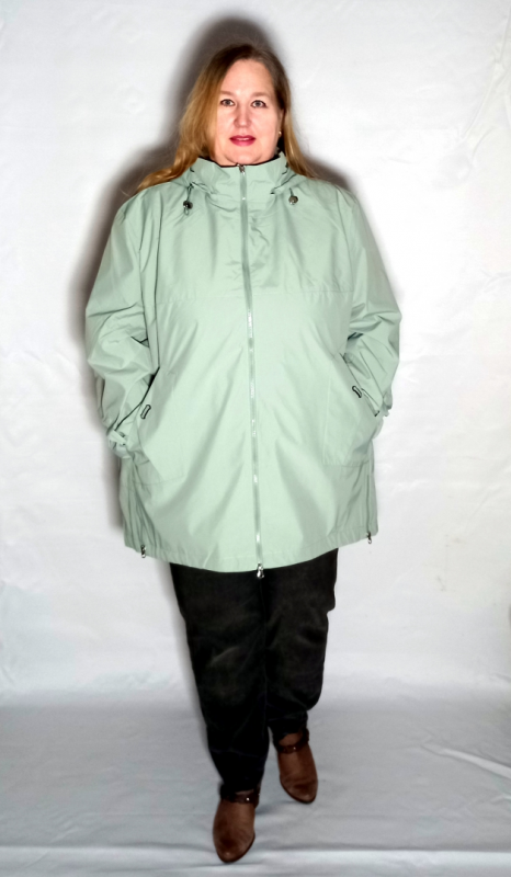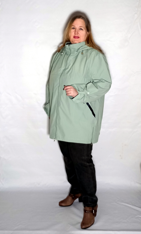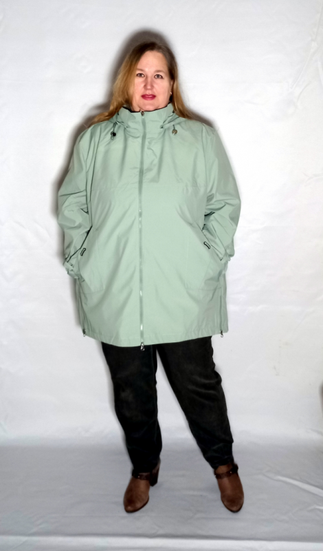 Глубокий капюшон, отстегивается. Внутренняя его поверхность из ткани с рисунком ( такой же декор на рукавах и на полочке вставка в области карманов.