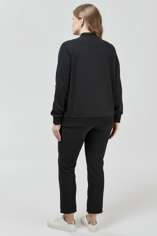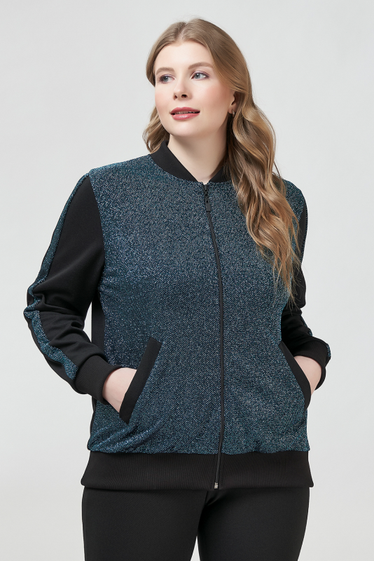 Модная ветровка бомбер, выполненная в стиле «спортивный шик», в комбинации блестящего и матового трикотажа, с длинными втачными рукавами на манжетах и с блестящими лампасами, застежке-молнии, воротником-полустойкой, косыми прорезными карманами с листочкой.