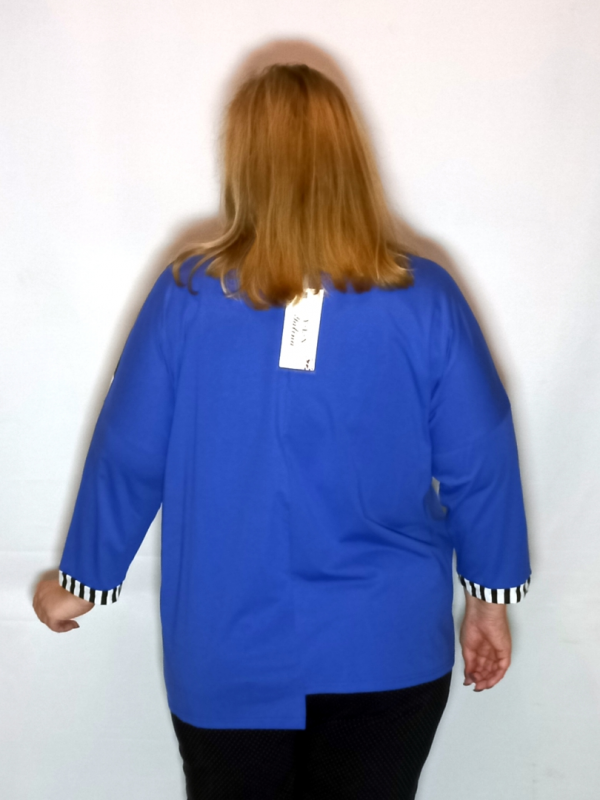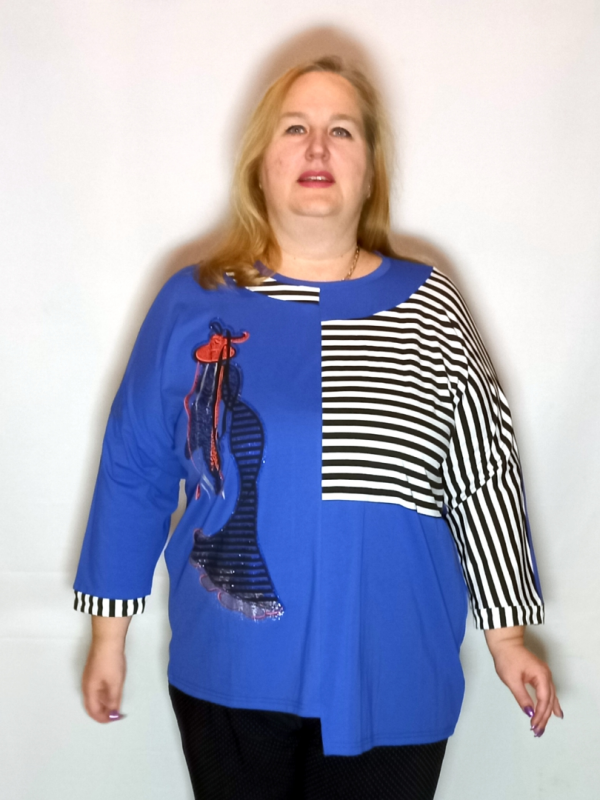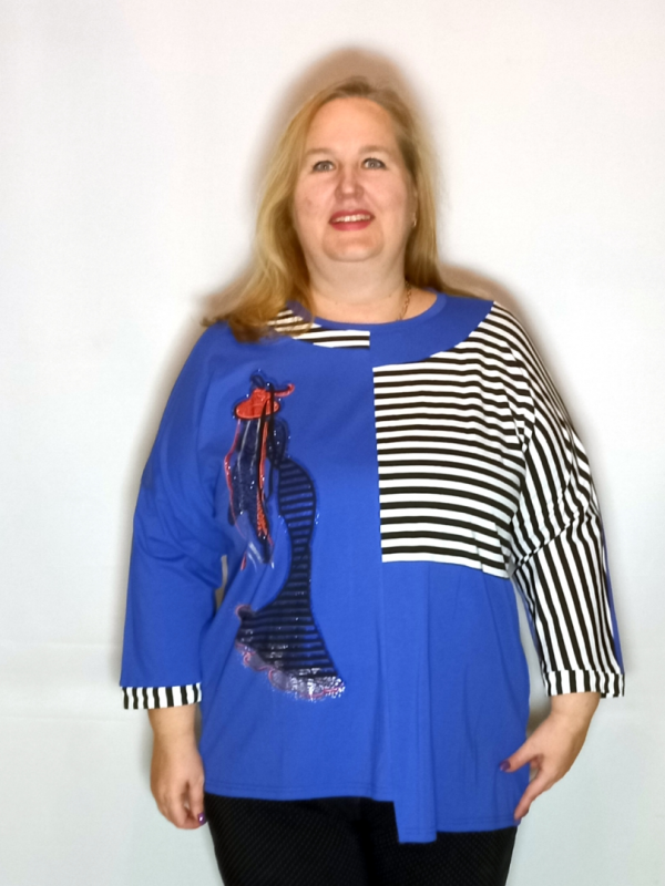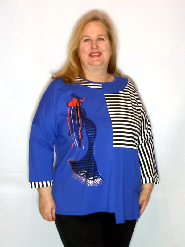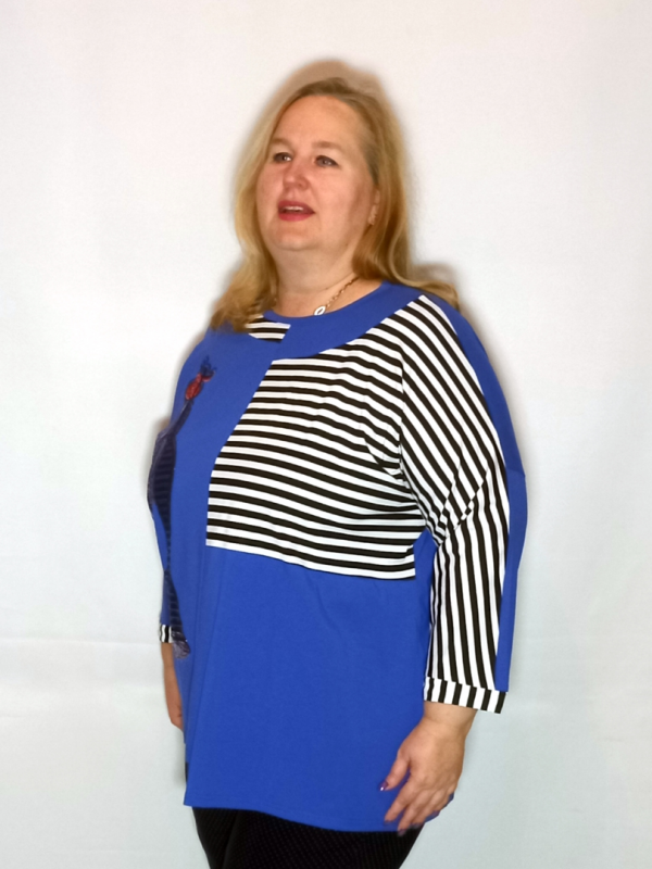 Туника выполнена из сочетания трикотаж однотонного и с рисунком.