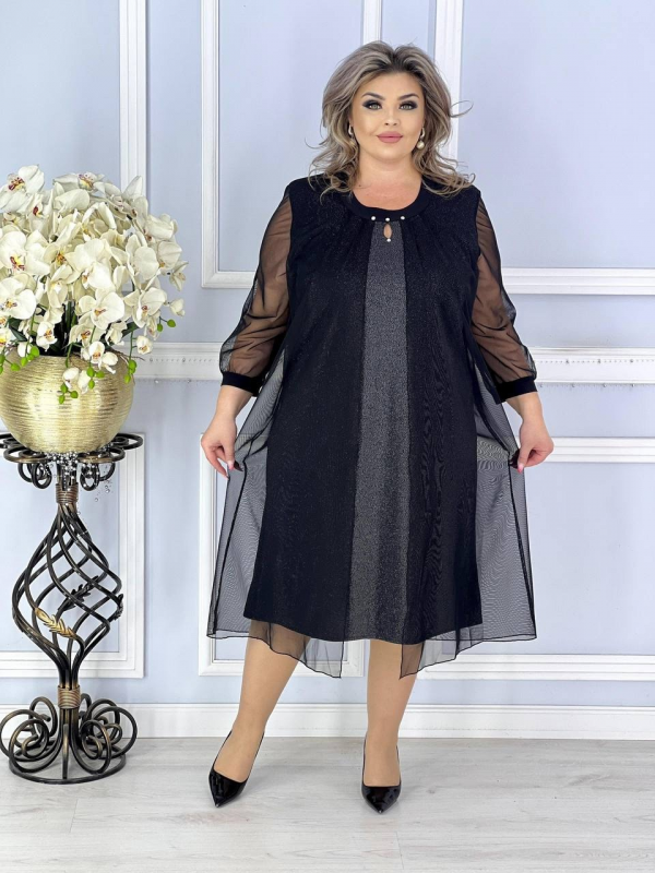 Элегантное , нарядное платье выполнено из трикотажа с люрексом ( нить в ткани, не осыпается) и черной сетки.