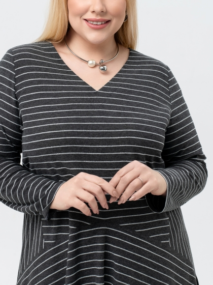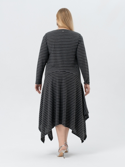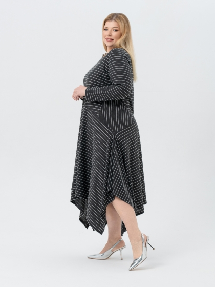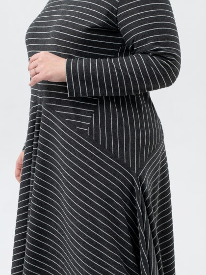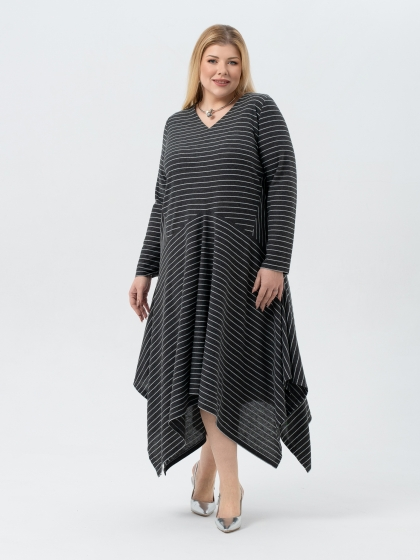Эффектное платье, выполненное из трикотажного полотна с выработкой в полоску - идеальный выбор для создания женственного образа. Модель длиной миди, с расширением к низу, является воплощением изящества и элегантности. V-образный вырез гармонично подчеркивает линию шеи, а отсутствие застежки обеспечивает легкость надевания. Рукав втачной, длинный. Вставки по бокам, на которых рисунок меняет свое направление, заметно стройнят фигуру. А диагональные подрезы, расходящиеся от центра, придают платью уникальный и запоминающийся вид. Это платье идеально подходит для особых мероприятий, подчеркивая вашу элегантность и утонченный вкус.