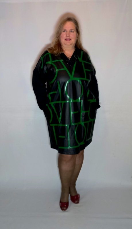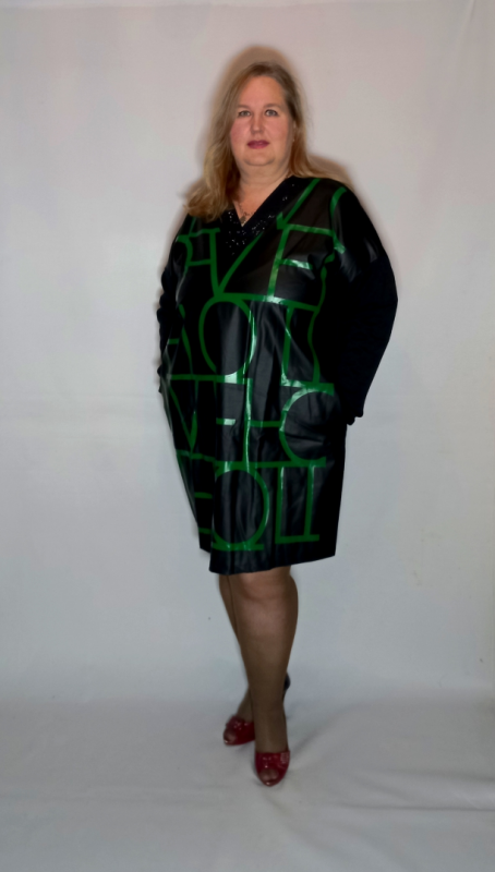 СТильное платье-туника выполнено из сочетания гладкого плотного трикотажа ( спинка и рукав) и трикотаж по д кожу. Однотонный трикотаж умеренно эластинчый, хорошо скрывает шероховатости фигуры. Трикотаж под кожу тянется слабее, но тянется