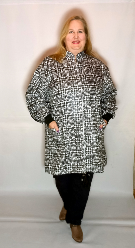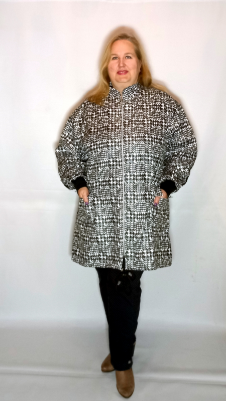 Модный плащ-пыльник выполнен из водоотталкивающей, гладкой с лицевой стороны, плащевой ткани с интересным принтом. Для отделки использовали эластичную тесьму с надписями.