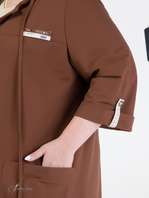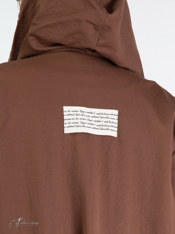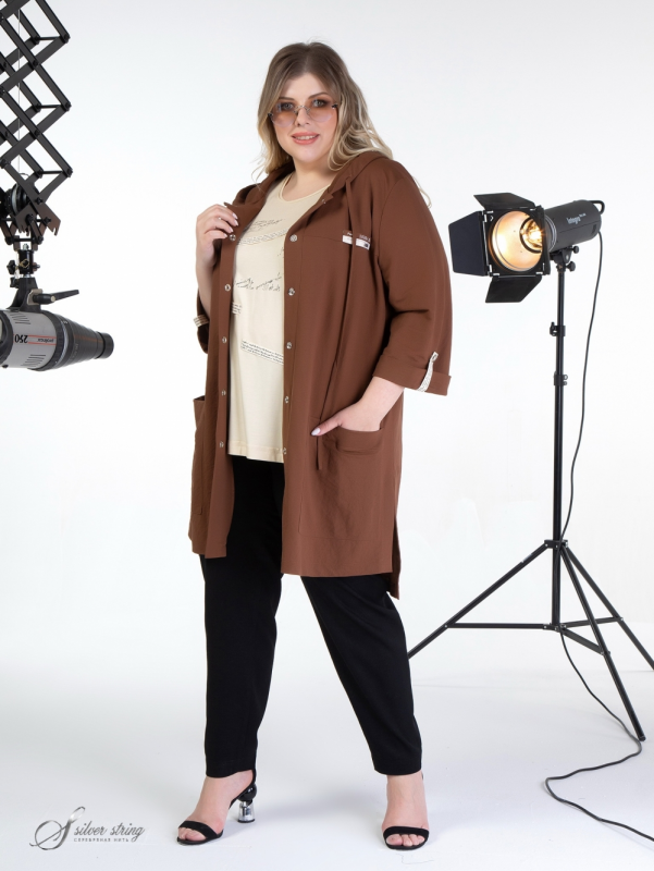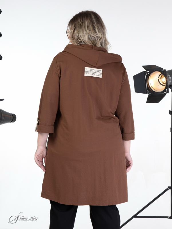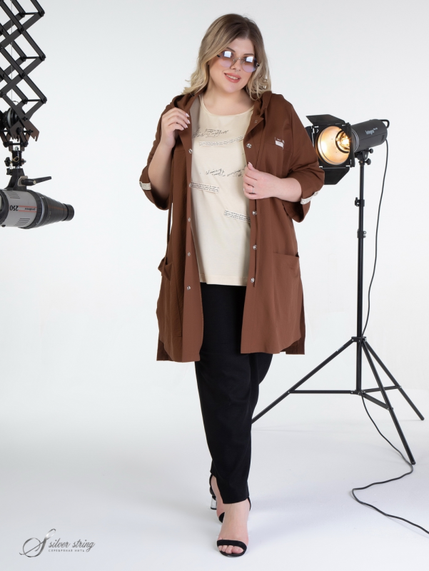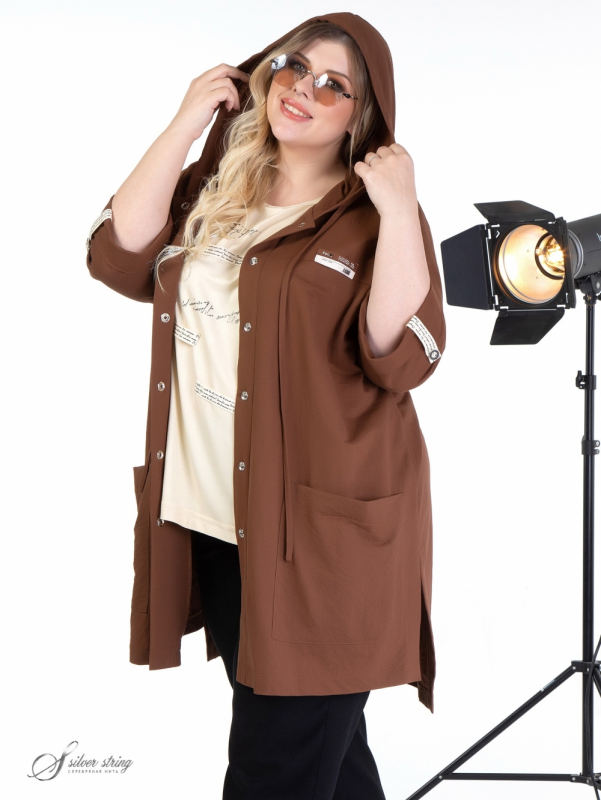 Облегченный жакет прямого силуэта, с капюшоном, выполнен из смесовой, эластичной ткани. Вдоль лицевого среза капюшона проложен шнур-затяжка. Модель с втачным рукавом, длиной 3/4. Низ рукава оформлен отворотом. На полочке расположены подрезные кокетки. Вдоль линии кокетки, на левой полочке, настрочен декоративный элемент. Паты рукавов выполнены из отделочной тесьмы с тиснением. Фрагмент аналогичной тесьмы настрочен по центру спинки. На полочке расположены крупные накладные карманы. По борту обработана планка с застежкой на эффектные кнопки. Это оригинальная модель, которая прекрасно впишется в Ваш гардероб и станет незаменимой при создании разнообразных комплектов.